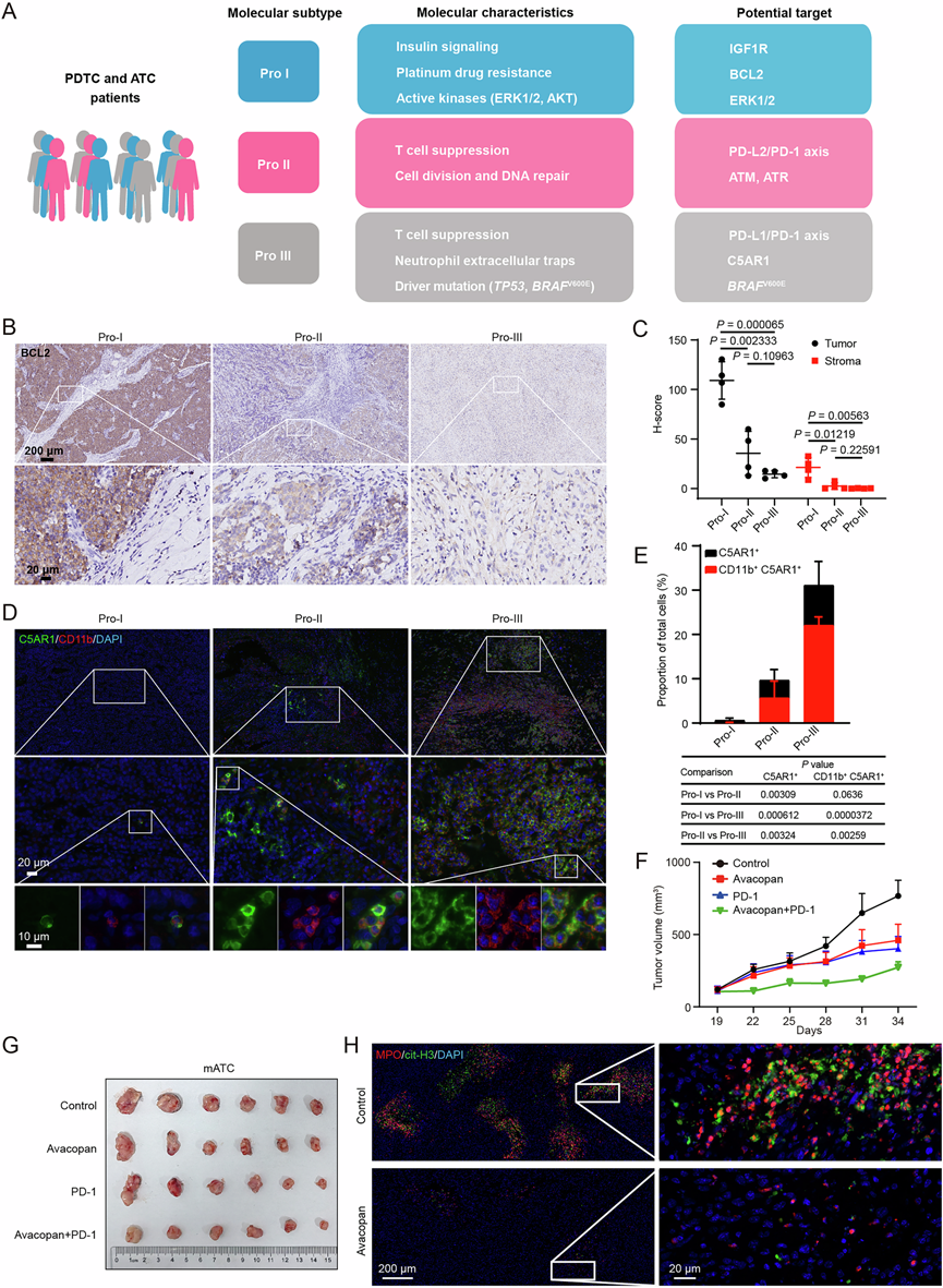 (A) 根据基于蛋白质组的 ATC/PDTC 亚型提出潜在靶点。(B-C) 三种蛋白质组亚型中 BCL2 的免疫组织化学染色。(D-E) 三种蛋白质组亚型中 C5AR1 和髓系标志物 CD11b 的免疫荧光染色。(F-G) 小鼠 ATC免疫功能模型中的肿瘤生长曲线和肿瘤大小。(H) 免疫荧光染色显示 Avacopan 治疗后 mATC 衍生肿瘤中 MPO 和 cit-H3 的代表性显微照片。