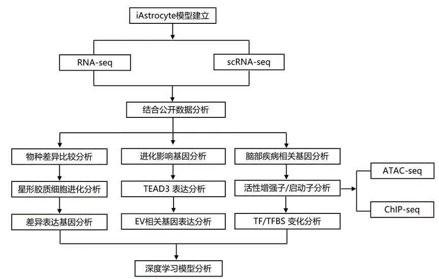 本研究获得了人类、黑猩猩和恒河猴iAstrocyte。人类iAstrocyte比非人类灵长类动物的iAstrocyte更大、更复杂。本研究鉴定出导致人类星形胶质细胞数量增加的新位点。与长距离胞间信号传导相关的基因和通路在人类iAstrocyte中发生激活,并参与控制iAstrocyte的复杂性。在人类iAstrocyte中下调的基因通常与神经系统疾病相关,而在成人脑样本中则有所减少。通过调控组分析和机器学习,发现增强子的功能性激活与此前未曾重视的“条纹”转录因子结合位点的普遍增加相吻合。总之,本研究揭示了灵长类星形胶质细胞进化的转录组特征和驱动获得增强子调控潜力的机制。
