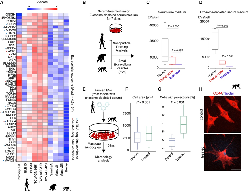 ExEg 类别中的基因包括与外泌体生物学有关的基因位点—外泌体是影响神经系统稳态和病理的细胞外囊泡 (EV)。为了确定三种灵长类动物的 iAstrocyte 之间的外泌体分泌是否存在差异,他们从 iAstrocyte 培养基中分离出分泌的颗粒,并使用纳米粒子跟踪分析(NTA) 对其进行了表征。这些颗粒对外脂膜(CellMask)和四跨膜蛋白(CD63、CD9、CD81)呈阳性,证实了它们的 EV 身份。人类 iAstrocyte 比 NHP iAstrocyte 产生的 EV 更多(图 3 B-D)。因此,人类星形胶质细胞的进化表现为 EV 产生的增强。