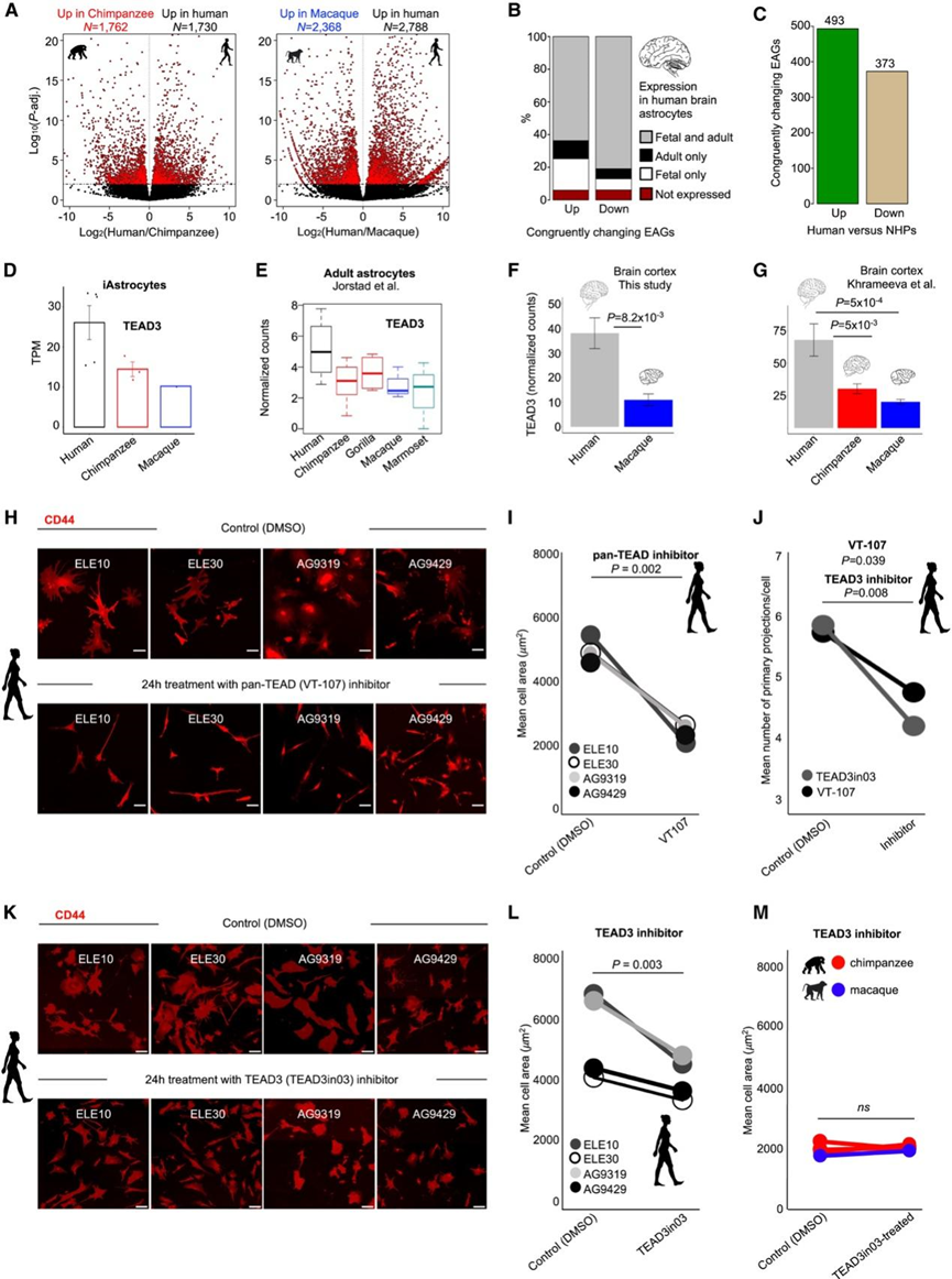 (A) 差异表达基因 (DEG) 的火山图。(B) 在急性纯化的胎儿和成人脑星形胶质细胞中表达中确定的基因座。(C) 人类与 NHP iAstrocyte 中鉴定的 EAG 的最终数量。(D) TEAD3 在灵长类动物星形胶质细胞中的表达。(E) TEAD3 在人类、黑猩猩、大猩猩、猕猴和狨猴成年颞中回皮质大脑星形胶质细胞中的表达。(F) TEAD3 在人类、黑猩猩、大猩猩、猕猴和狨猴成年颞中回皮质大脑星形胶质细胞中的表达。(G) TEAD3 在人类、黑猩猩和猕猴脑皮质组织中的表达。(H) TEAD3 在人类、黑猩猩和猕猴脑皮质组织中的表达。(I) 泛 TEAD 抑制对人类 iAstrocyte 形态的影响。(J) 泛 TEAD 抑制对人类 iAstrocyte 形态的影响。(K) 使用 TEAD3in03进行特定的 TEAD3 抑制会导致人类 iAstrocyte 形态发生变化。(L) TEAD3 抑制会减少人类 iAstrocyte 面积。(M) TEAD3 抑制对 NHP iAstrocyte 形态没有影响。