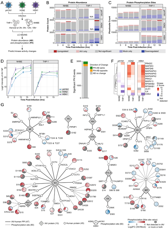 (A) 实验设计工作流程。 (B)蛋白质丰度。(C) 磷酸化蛋白位点。(D) NHBE和THP-1细胞感染pH1N1、H3N2和H5N1 IAV后,检测IAV NP AB的强度。 (E) 所有肽的 PH 和 AB 数据的相关性。 (F) IAV 感染的 NHBE 和 THP-1 细胞中 FDR < 0.05 的预测激酶活性(激酶 Z 评分)热图。(G) IAV-human-PPI 图。