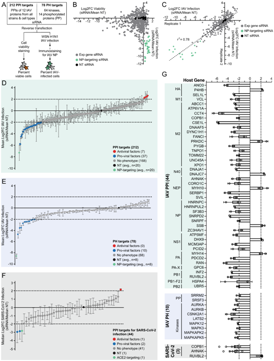 (A) 在 A549 细胞中采用阵列 siRNA 筛选方法。(B-C) 各生物复制品中各 siRNA 对抗 IAV 感染的细胞活力和IAV 感染的差异。(D-F) 212 个 PPI 目标和78 个 PH 目标的 IAV 感染中 log2FC 的分布。(G) IAV和SARS-CoV-2筛查的前病毒和抗病毒因子柱状图绘制为IAV感染的平均log2FC。