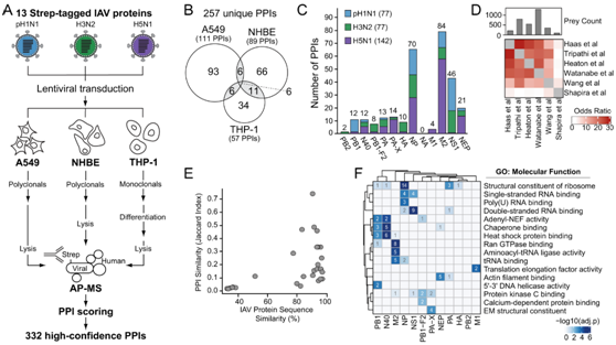 (A) AP -MS 实验设计。 (B) 在每种细胞类型中鉴定出的IAV-human PPI的维恩图。(C) 每个IAV蛋白和菌株的独特IAV-human PPIs柱状图。(D) 比较人类相互作用蛋白的鉴定相关矩阵。 (E) Jaccard指数比较共有蛋白相互作用(PPI相似性)与IAV蛋白序列相似性。(F) GO分析。