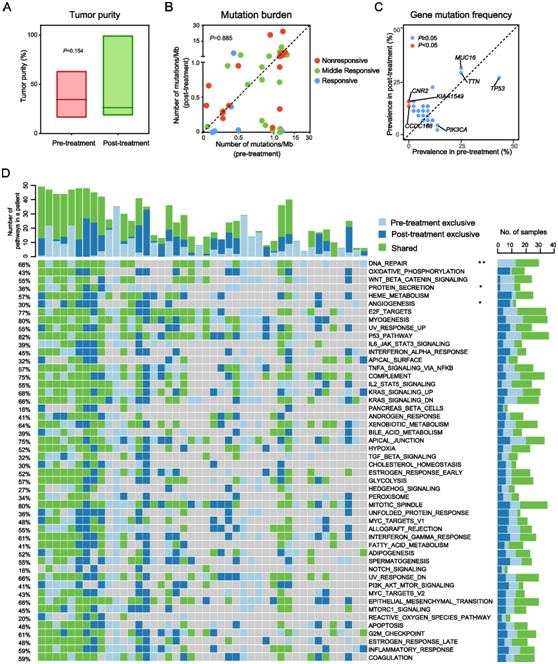 图2. 配对治疗前和治疗后肿瘤样本之间基因突变、突变负荷和 MSigDB 通路的变化。44 个配对治疗前和治疗后肿瘤之间的肿瘤纯度