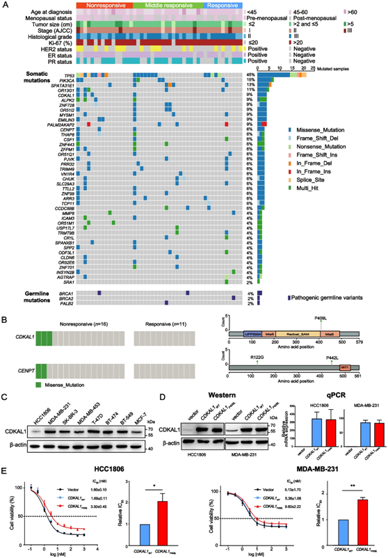 (A) 47 个治疗前肿瘤中的体细胞和种系突变以及匹配的种系 DNA。(B) 无反应和有反应预治疗组中CDKAL1和CENPT潜在有害突变的分布(左)。代表潜在有害突变的蛋白质结构域的图表(右)。(C-D) 免疫印迹和qPCR分析。(E)细胞活力分析。