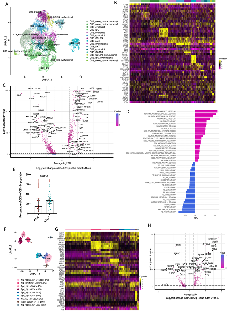 (A) UMAP 显示上述 7 位患者的综合 CD8 细胞聚类。(B) 热图显示每个聚类中上调最多的基因。(C) CD8 T 细胞 NACT 与 PDS 中的差异表达基因。(D) CD8细胞中 NACT 与 PDS 中差异富集的通路。(E) 流式细胞分析。(F) UMAP显示来自 7 位患者的综合 NKTgd 细胞聚类。(G) 热图显示 NKTgd 亚群中每个聚类中上调最多的五个基因。(H) NACT 与 PDS 中 NKTgd 细胞的差异表达基因。