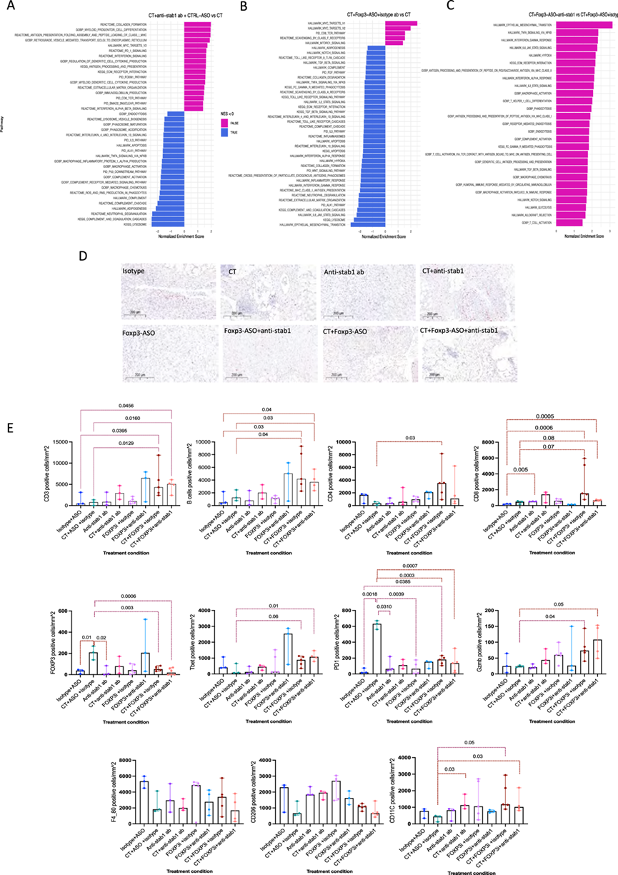 与对照组相比,FOXP3-ASO 抗体单药治疗可显著上调免疫激活途径。此外,与 CT 联合使用时,与 CT 相比,可显著激活免疫通路(图 7B)。与单独使用 CT 或与抗 STAB1 抗体或 FOXP3-ASO 联合使用相比,三联疗法可显著提高免疫激活途径水平(图 7B-C)。