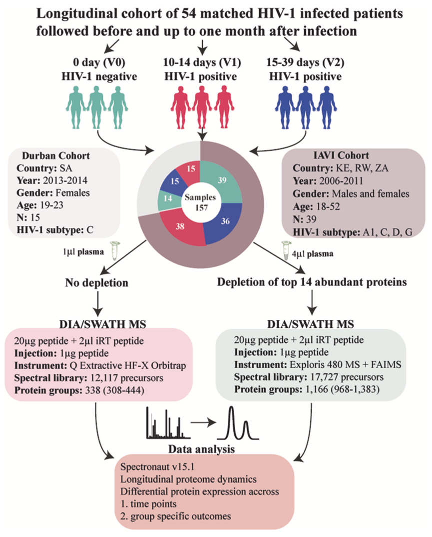虽然健康个体的血浆蛋白质组通常保持稳定,但已有记录表明,在应对不同感染(包括严重急性呼吸综合征冠状病毒以及细菌性和病毒性肺炎)时会出现扰动。了解这些感染中血浆蛋白质组学的差异表达对于诊断、预防和治疗干预起着关键作用。在HIV-1 感染中,感染最早阶段——超急性 HIV-1 感染(hAHI,定义为从血浆病毒血症开始到病毒载量达到峰值的时期)——的病毒-宿主相互作用会触发复杂的细胞和组织信号事件网络。这会导致快速的全身免疫激活和细胞微环境重组。超急性 HIV-1 感染期间血浆中蛋白质表达的复杂动态及其与急性逆转录病毒综合征、病毒控制和疾病进展的关系在很大程度上是未知的。