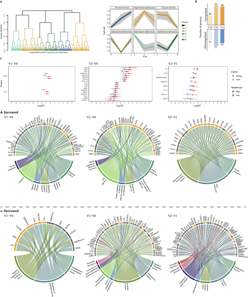 (a)确定6个不同的聚类。(b) 条形图显示差异表达蛋白质数量的比较。(c) 在估计感染日期 (EDI) 后 2 周和 1 个月时显著差异表达的蛋白质的效应大小和 95% 置信区间,以及 EDI 后 2 周和 1 个月 (V2-V1) 之间的差异。(d-e) Circos图以圆形布局可视化不同访问差异中差异表达的蛋白质。