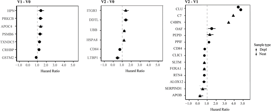 使用 CD4+ T 细胞反应来定义疾病进展。在 EDI 后的 12 个月随访中,参与者贡献了中位数为 13的 CD4+ T 细胞计数值。快速进展者定义为在 EDI 后 12 个月内达到 CD4+ T 细胞计数 <500 细胞/mm3 的参与者(不包括前 6 周内的测量值),而缓慢进展者定义为在同一时期维持 CD4+ T 细胞计数 >500 的参与者。在 54 名参与者中,12 名(22%)归类为缓慢进展者,42 名(78%)归类为快速进展者。与 IAVI 研究参与者相比,来自德班的研究参与者疾病进展较慢的可能性更高。使用 Cox 回归模型(控制年龄和队列)比较访问期间蛋白质水平的变化。在 V1-V0、V2-V0 和 V2-V1 时,分别有 7 种、6 种和 14 种蛋白质与 HIV-1 疾病进展加快相关。具体而言,在 V1–V0 处,Hepsin (HPN)、蛋白激酶 Cβ (PRKCB)、促皮质素释放激素结合蛋白 (CRHBP)、蛋白酶体亚基 β 型 6 (PSMB6)、硫氧还蛋白结构域蛋白 5 (TXNDC5) 和载脂蛋白 C4 (APOC4) 水平的升高与 HIV-1 疾病进展风险的增加有关(图5)。V1-V0 时谷胱甘肽 S-转移酶 Mu 2 (GSTM2) 水平降低与疾病进展加快相关。HR 为 1.3 表示从 V0 到 V1 蛋白质水平翻倍与 EDI 后 1 年内 CD4+ T 细胞计数降至 500 个细胞/μl 血液以下的风险增加 30% 相关。有趣的是,根据 HIV-1 相互作用数据库,所有已鉴定的蛋白质均已显示与 HIV-1 包膜相互作用。此外,整合素亚基β3(ITGB3)、热休克70 kDa蛋白8(HSPA8)、D-多巴色素互变异构酶样蛋白(DDTL)和泛素B(UBB)在V2-V0时的水平升高与疾病进展风险增加有关。CD84和潜在转化生长因子β结合蛋白1(LTBP1)水平降低与疾病进展风险降低有关。值得注意的是,所有这些蛋白质都与不同的 HIV-1 蛋白相互作用进行介导。