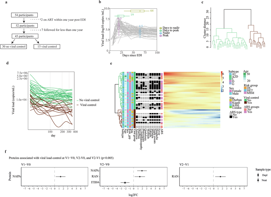 (a) 流程图说明病毒控制分类中使用的样本总数以及排除标准。(b) 纵向病毒载量与所有 54 名参与者的估计感染日期 (EDI) 后的天数的对比。(c) 树状图展示病毒载量谱的完整链接层次聚类。(d) 表示三次样条函数在均匀分布的时间点预测的病毒载量图。(e) 热图说明病毒控制与各种人口统计参数和 ARS 症状之间的关联。(f) 在估计感染日期 (EDI) 后 2 周和 1 个月显著差异表达的蛋白质,以及 EDI 后 2 周和 1 个月 (V2-V1) 之间的差异。