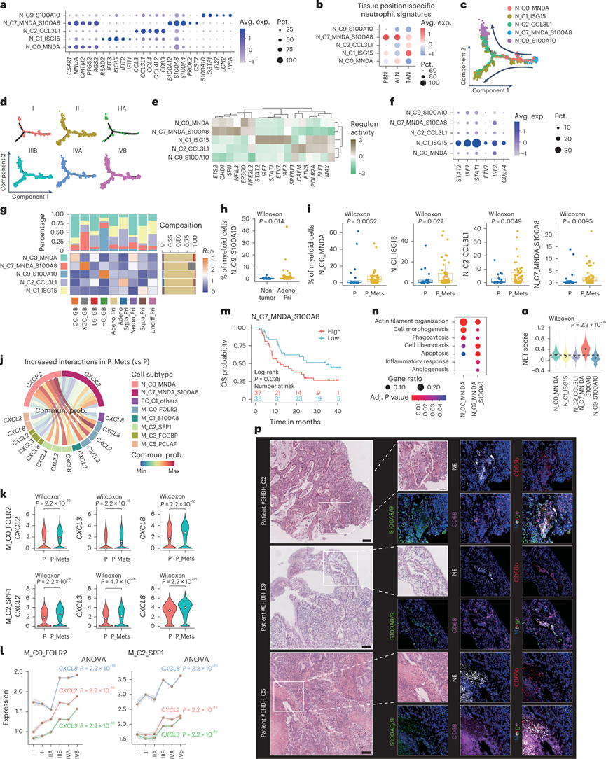 (a) 中性粒细胞亚型间 DEG 表达。(b) 不同组织位置的中性粒细胞特征评分。(c-d) 中性粒细胞的拟时间轨迹。(e-f) 特异性转录因子和CD274的表达。(g) 热图显示通过Ro/e估计的不同疾病患病率。(h) 箱线图比较非肿瘤和 Adeno_Pri之间的中性粒细胞亚型比例。(i) 箱线图比较 P(局限性原发性胆囊腺癌;n = 20)和 P_Mets(转移性原发性胆囊腺癌;n = 55)之间的中性粒细胞亚型比例。(j) 弦图描绘了 P_Mets 与P之间相互作用的增加。(k) 巨噬细胞亚型的趋化因子表达。(l) 跨 TNM 分期的巨噬细胞亚型趋化因子表达模式。(m) 按 N_C7_MNDA_S100A8 百分比分组的 Kaplan–Meier 生存图。(n) Adeno_Pri 与非肿瘤组织中 N_C0_MNDA 和 N_C7_MNDA_S100A8 的上调通路。(o) 中性粒细胞亚型中中性粒细胞胞外陷阱 (NET) 特征得分。(p) H&E 和 CODEX 成像用于识别患者中 NE 标记的 NET、CD66b 和 S100A8/9 标记的 S100A8 +中性粒细胞以及 CD68 标记的巨噬细胞。
