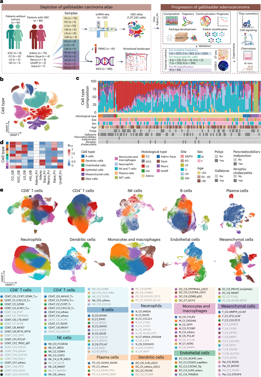 (a) 本研究策略的示意图。(b) 主要细胞类型的均匀流形近似和投影 (UMAP) 可视化。(c) 堆叠条形图显示每个样本中主要细胞类型的分布。(d) Ro/e表示不同胆囊疾病中细胞类型的富集。(e) UMAP 图显示细胞亚型。