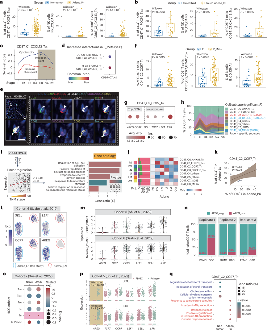 (a-b) 肿瘤与 Adeno_Pri以及配对 NAT与 Adeno_Pri之间的亚型比例。(c) 跨 TNM 分期的细胞毒性和免疫检查点评分。(d) P_Mets 与 P 之间相互作用增加。(e) 代表性 CODEX 图像显示 CTLA4 + CXCL13 + CD8 + T 细胞和 CD86 + S100A8 +巨噬细胞。(f) P和P_Mets之间的亚型比例。(g) DEG 和幼稚 T 标志物的表达。(h) TNM 分期中亚型组成的动态变化。(i) 实验流程显示 TNM 分期变量基因选择(双侧t检验)和通路富集直方图。(j) 通过Ro/e估计的不同组织部位患病率。(k) Adeno_Pri 和 Adeno_LN 之间百分比的Pearson 相关性。(l-m) Adeno_LN 和 Normal_LN以及 GBC_PBMC 和 Normal_PBMC中幼稚 CD4 + T 细胞的基因表达。(n) 通过流式细胞分析检测到的AREG +幼稚CD4 + T细胞百分比。(o-p) CD4 + T 亚型的基因表达。(q) 非肿瘤和 Adeno_Pri 之间的 CD4T_C2_CCR7_TN富集通路。
