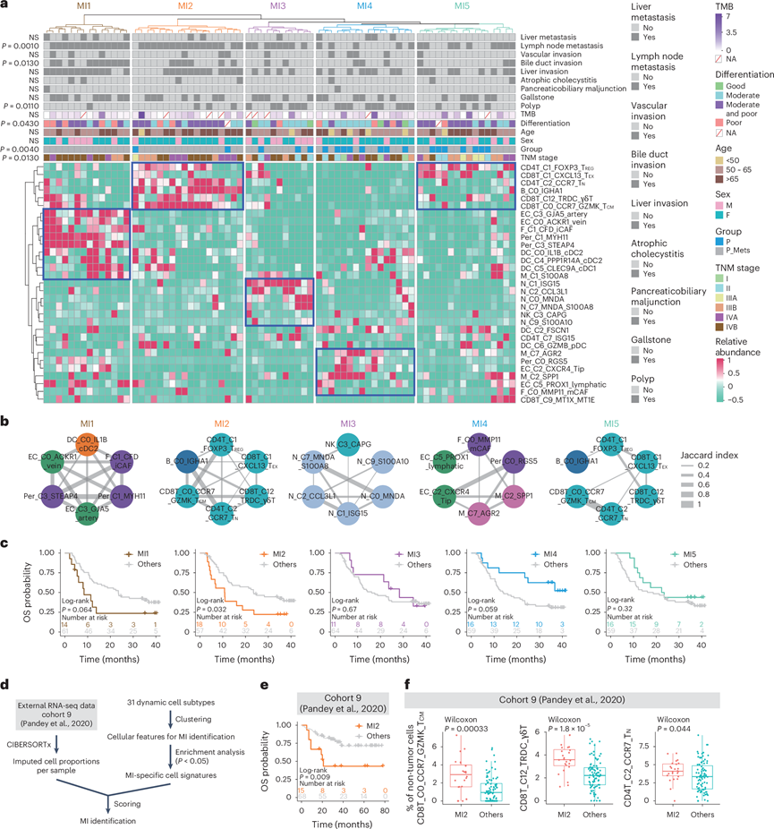 (a) 根据 75 名胆囊腺癌患者原发性肿瘤中动态细胞成分的百分比,将 5 种不同的微环境聚类。(b) 网络图显示亚型共存的 Jaccard 相似指数。(c)患者的总生存期 (OS)。(d)实验流程。(e) MI2 患者的 OS。(f) 箱线图比较了 MI2和其他微环境中 MI2 特异性亚型的比例。