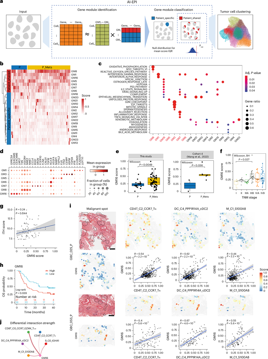 (a) AI-EPI 示意图。(b) 不同患者的平均基因模块得分。(c) 每个基因模块的富集通路。(d) 患者共有基因模块内选定的标记基因的表达。(e) 本研究中P和 P_Mets之间(左)以及外部数据集中 P和 P_Mets之间的 GM16 特征得分分布(右)。(f) 跨 TNM 分期的动态 GM16 得分。(g) GM16 与肿瘤内异质性 (ITH) 评分的 Pearson 相关性。(h) Kaplan-Meier 图显示按 GM16 评分分组的患者的 OS。(i) H&E 图像显示在左上角。(j) 由 CellChat 推断的差异相互作用强度。