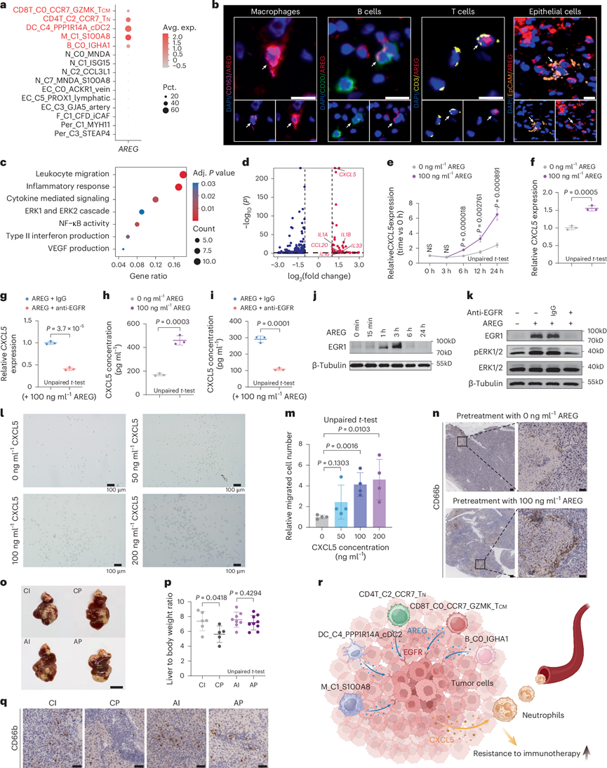 (a) 不同亚型的 AREG表达。(b) 代表性多重免疫组织化学图像,显示巨噬细胞、B 细胞、T 细胞和上皮细胞中的 AREG 表达。(c-d) AREG 处理后GBC -SD 细胞中上调的通路和 DEG。(e) 在不同时间点(每组n =3)用 qPCR 测量 GBC-SD 细胞中CXCL5的表达。(f-i) CXCL5 RNA 和蛋白质水平。(j-k)免疫印迹分析。(l-m) HL-60 细胞迁移的代表性图像和定量。(n) 免疫组织化学显示中性粒细胞浸润。(o-p) 不同条件下的代表性图像和肝重与体重的比率。(q) 使用肿瘤切片通过免疫组织化学测量的中性粒细胞浸润的代表性图像。(r) AREG 在 GBC 中的作用示意图。
