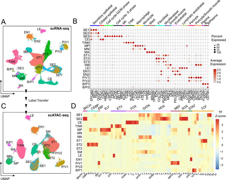 (A) 在 正常绝经前输卵管的壶腹部和输卵管伞部中发现的典型细胞类型和亚型。UMAP 图可视化了使用 scRNA-seq 鉴定出的 19 个细胞聚类。(B) 点图显示与数据集 (scRNA-seq) 中鉴定出的常见细胞类型相关的典型标记基因的标准化基因表达水平。(C) UMAP图可视化了使用 scATAC-seq 在绝经前壶腹部和输卵管伞部中鉴定出的 16 个细胞聚类。(D) 热图显示基于 scATAC-seq 数据的细胞聚类对转录因子 (TF) 活性的富集。