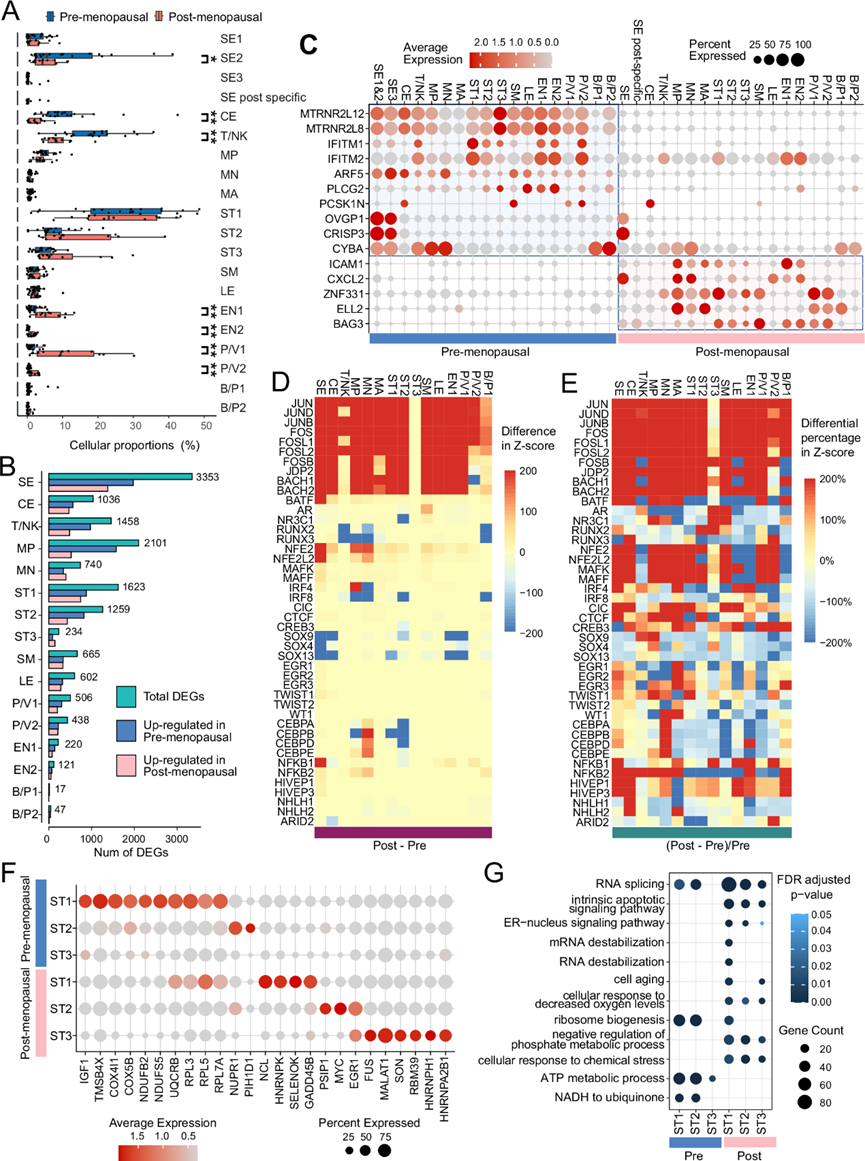 (A) 绝经前女性和绝经后女性在综合解剖部位(壶腹部和伞部)细胞组成的差异百分比。(B) 差异表达基因的数量分析。(C) 点图显示单个细胞聚类(scRNA-seq) 中选定的、特定于绝经状态的差异表达基因的标准化基因表达水平。(D) 热图显示使用 scATAC-seq 的细胞聚类中选定的转录因子 (TF) 活性的绝对差异。(E) 热图显示使用 scATAC-seq 数据的细胞聚类中选定的TF活性的相对变化。(F) 点图显示绝经前和绝经后 ST 亚型中选定基因的标准化基因表达水平。(G)GO分析。