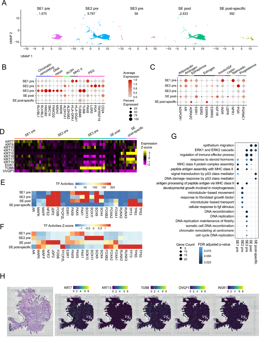 (A) 使用 UMAP 分析识别的绝经前和绝经后 SE 细胞。(B) 点图显示基于 scRNA-seq 数据的绝经前和绝经后 SE 亚型中与增殖、干性和 PEG 细胞相关的选定标志物的归一化基因表达水平。(C) 点图显示基于 scRNA-seq 数据的绝经前和绝经后 SE 亚型中激素受体的归一化基因表达水平。(D) 基于 scRNA-seq 数据(壶腹部和输卵管伞)的热图显示了单个样本水平上 SE 绝经前和绝经后亚型中靶基因的平均表达。(E) 使用 scATAC-seq 数据显示 SE 亚型中的绝对转录因子活性的热图。(F) SE 亚型中的相对转录因子活性的热图。(G)GO分析。(H) 使用 10x Genomics Visium对正常绝经前输卵管伞部进行空间转录组学分析。