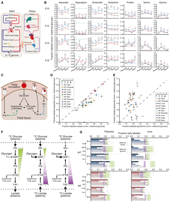 通过中心碳代谢追踪[U- 13C]葡萄糖揭示了胎儿组织如何获取生物量构建模块。在整体水平上,他们认为胎儿循环系统通过从胎盘到肝脏、心脏和大脑的路径与母体循环相连(图4A)。他们观察到,胎儿中有 7 种非必需氨基酸(Asp、Asn、Glu、Gln、Pro、Ser 和 Gly)由13C 标记,而这 7 种中,天冬氨酸和甘氨酸在母体血浆中未标记(图 4B)。因此,天冬氨酸和甘氨酸完全由胎儿组织合成。母体和胎儿的代谢为胎儿贡献了 5 种氨基酸(Asn、Glu、Gln、Pro 和 Ser),其他 13 种氨基酸完全来自母体。