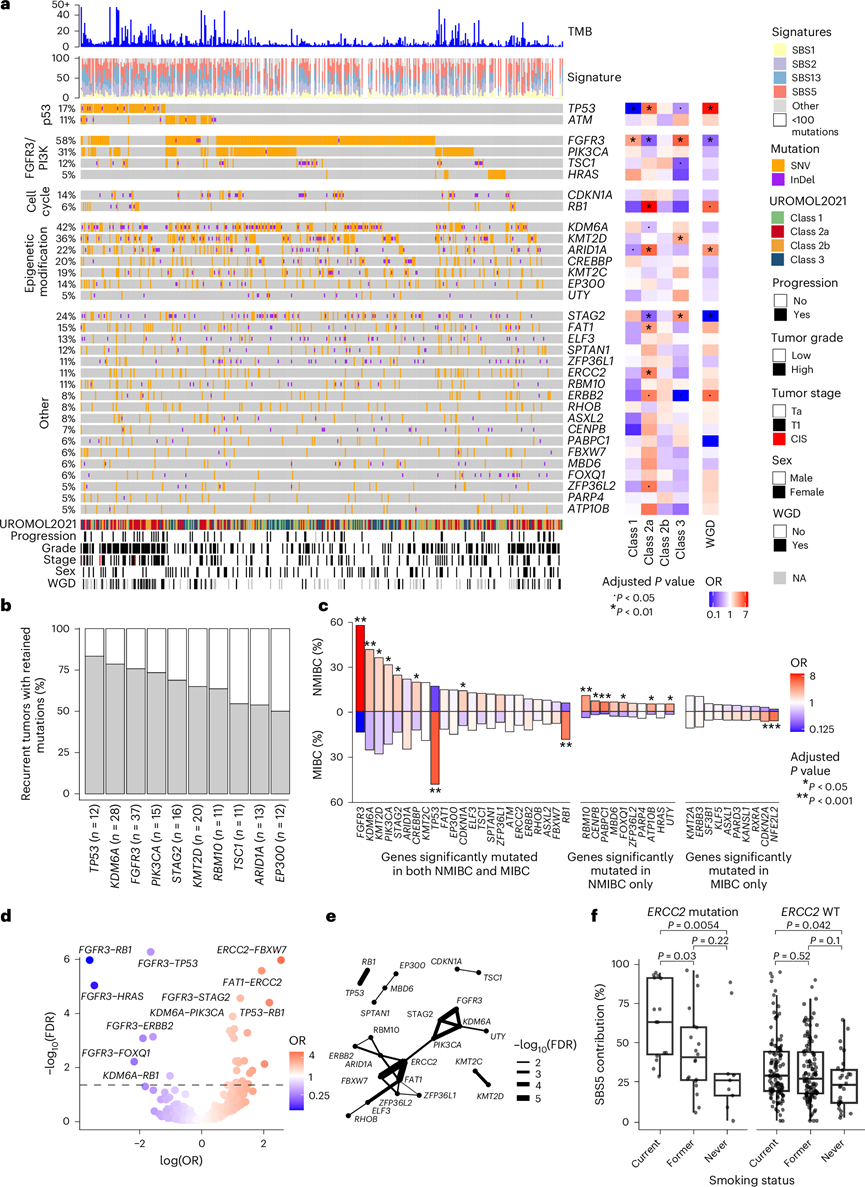(a) 队列中 33 个显著突变基因的 Oncoplot。(b) 60 名患者的配对复发肿瘤中的基因突变比较。(c) NMIBC和 MIBC 中突变频率的比较。(d) 33 个显著突变基因之间的共现程度(红点)和互斥程度(蓝点)。(e) 显著共存突变网络。(f) 按吸烟状况和ERCC2突变状况分层的 SBS5 特征突变百分比。