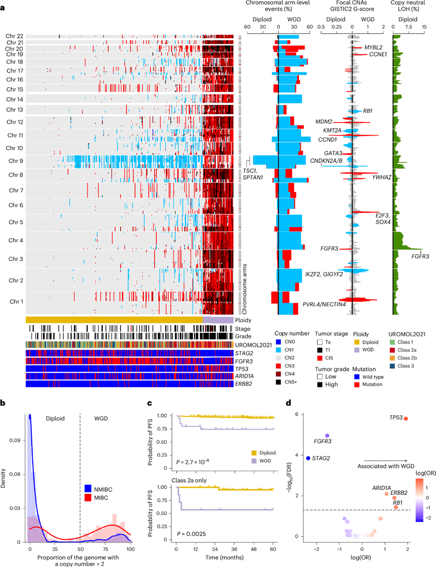 他们对 362 个肿瘤的 DNA 进行浅层全基因组测序(sWGS)来分析总拷贝数变异 (CNA)情况。此外,结合WES 数据,并使用常见杂合单核苷酸多态性处的每个亲本等位基因的计数来鉴定不平衡的拷贝数片段(图2a)。为简单起见,他们将使用全基因组加倍 (WGD) 术语来指代具有高拷贝数的肿瘤。如果 >50% 的基因组的拷贝数 >2(图2b),则将肿瘤归类为具有 WGD。归类为二倍体的肿瘤相比,在归类为具有 WGD 的肿瘤中具有四个拷贝的拷贝数片段基本平衡,从而增强了相应分类的有效性。对来自 MIBC(TCGA 队列)的数据使用类似的分析方法,不出所料地发现具有 WGD 的肿瘤比例更高(图2b)。具有 WGD 的肿瘤的中位染色体倍性(ploidy)对于 NMIBC为 3.5,对于 MIBC 为 3.3,反映了 WGD 肿瘤中存在高度缺失。此外,具有 WGD 的肿瘤在拷贝数增益方面富集。