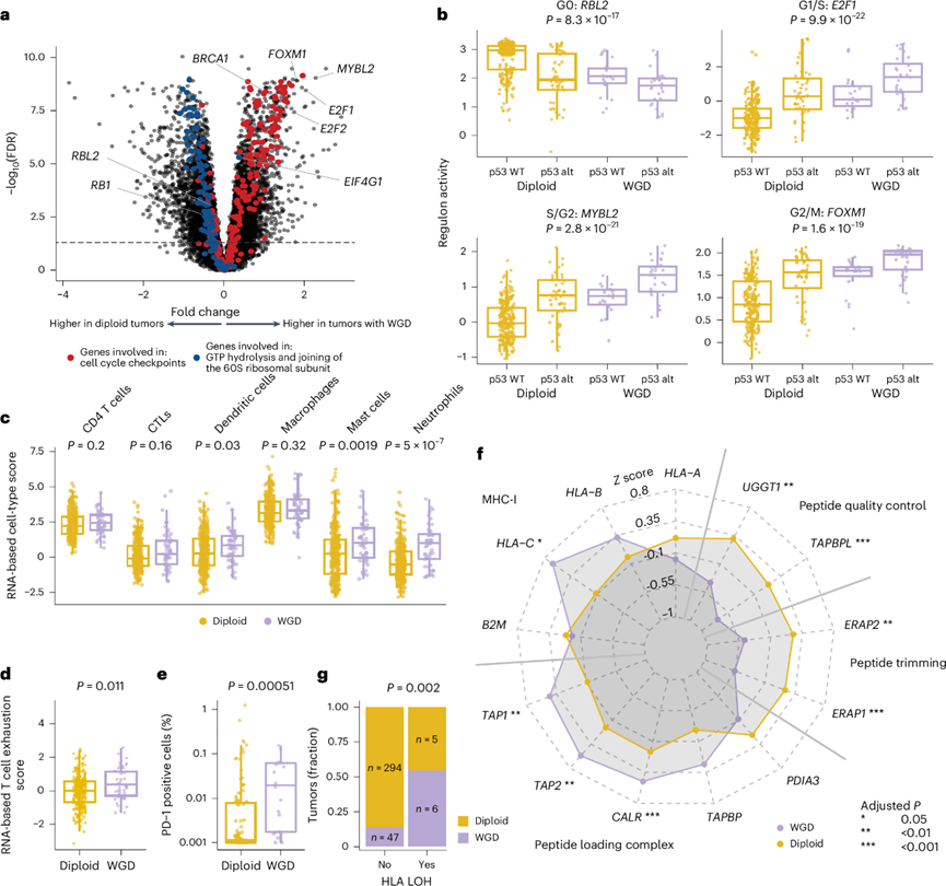 (a) 二倍体肿瘤与具有 WGD 的肿瘤之间差异表达基因的火山图。(b) 参与细胞周期不同步骤的基因的调节子活性。(c) 按染色体倍性状态分层的估计的基于 RNA 的细胞类型评分。(d) 根据染色体倍性状态分层的估计的基于 RNA 的 T 细胞耗竭评分。(e) 通过 IHC 评估的癌细胞区域(不包括基质区域)中 PD-1 阳性细胞的百分比。(f) 蜘蛛图显示按染色体倍性状态分层的参与抗原加工和呈递的基因的基因表达中位z分数。(g) 二倍体肿瘤和具有 WGD 的肿瘤中具有 HLA LOH 的肿瘤比例。
