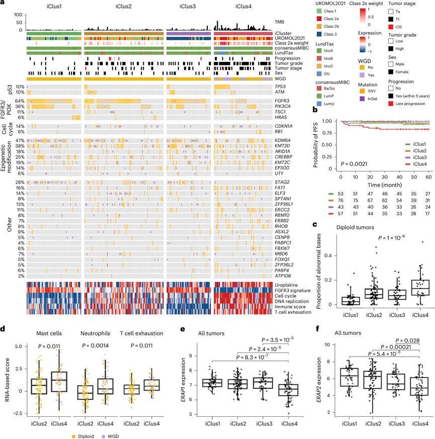 他们使用综合聚类描绘了 NMIBC 的生物学框架,以研究多组学数据的整合是否提供了超出肿瘤单层分层的额外生物学和预后价值。对于 230 个具有重叠数据层的肿瘤,他们对体细胞突变、CNA 和基因表达数据进行了联合聚类,并确定了四个“iCluster”,标记为 iClus1-4(图5a)。iCluster 与 UROMOL2021 类和 WGD 状态重叠。iClus4 包括 UROMOL2021 2a 类和 2b 类肿瘤的混合,包括所有 2a 类肿瘤的 70% (26/37) 和所有 2b 类肿瘤的 38% (29/77),以及 93% (26/28) 的 WGD 肿瘤(图5a)。因此,iCluster 与 PFS 相关(图5b),其中 iClus4 肿瘤具有最高的进展风险,与肿瘤分期和 UROMOL2021 分类无关。 iClus4 肿瘤具有更高的 2a 类加权计算机病理学(WISP)权重,TMB 更高并且基因组更不稳定,仅评估二倍体肿瘤时也是如此(图5c)。