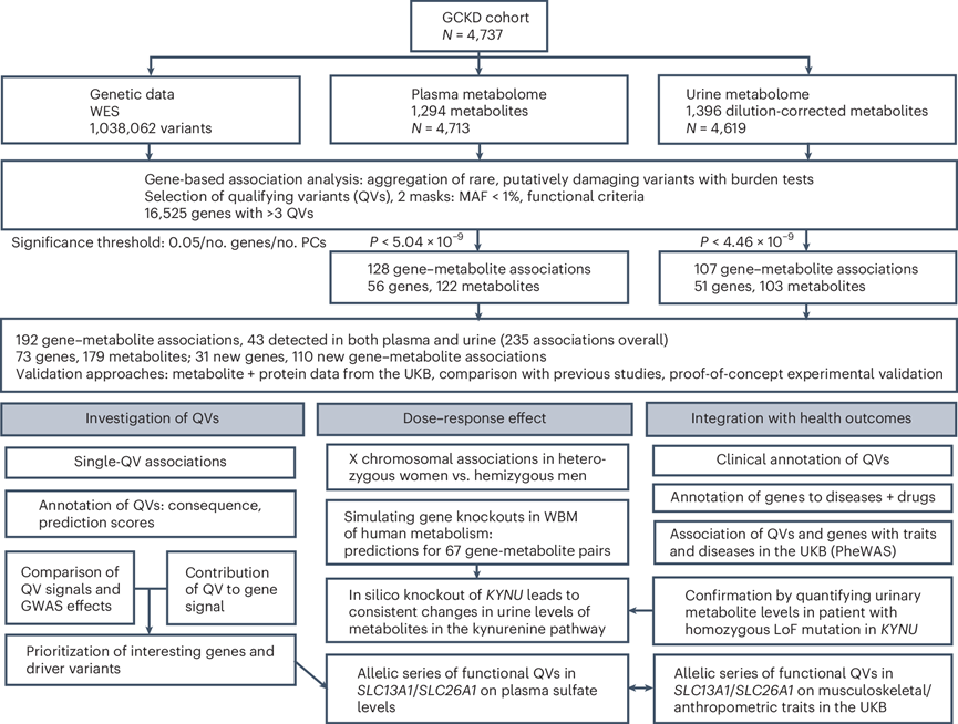 数千种酶和转运蛋白通过复杂的相互作用维持代谢中间体和终产物的生理水平。这些蛋白的功能紊乱会导致严重疾病,例如由先天性代谢障碍 (IEM) 引起的疾病,或使人易患 2 型糖尿病或痛风等常见代谢疾病。在大群体中开展的全基因组关联研究 (GWAS) 发现了数千种与代谢物水平改变相关的常见遗传变异,但这些变异的功能效应通常未知,而且其适度的效应大小限制了它们对临床的直接影响。以前,这类研究几乎只集中在循环代谢组上。但最近研究表明,配对的血浆和尿液代谢组的 GWAS 不仅可以揭示更多的关联,而且还可以提供对肾脏代谢物处理的具体见解。因此,本研究旨在使用全外显子组测序 (WES) 数据对德国慢性肾脏病 (GCKD) 研究中 4737 名参与者的 1294 种血浆和 1396 种尿液代谢物水平的总体影响进行基因分析,以鉴定与代谢相关的基因,并了解潜在的罕见的、几乎完全是杂合的变异是否允许与从 IEM 研究中获得的推论互补的推论。