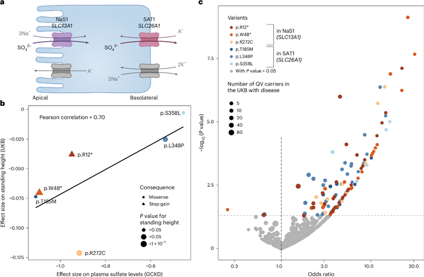 (a) 涉及上皮细胞顶膜上由SLC13A1编码的 NaS1 和基底外侧膜上由SLC26A1编码的SAT1的硫酸盐重吸收机制示意图。(b) 散点图显示了六种 QV 对 GCKD 研究中血浆硫酸盐水平(x轴)和 UKB(N ≥ 466907)中站立高度(y轴)的效应大小之间的关系。(c) 火山图显示 基于 Firth 回归,六种 QV 与 UKB(N ≥ 468279)中的肌肉骨骼疾病和骨折关联的优势比。