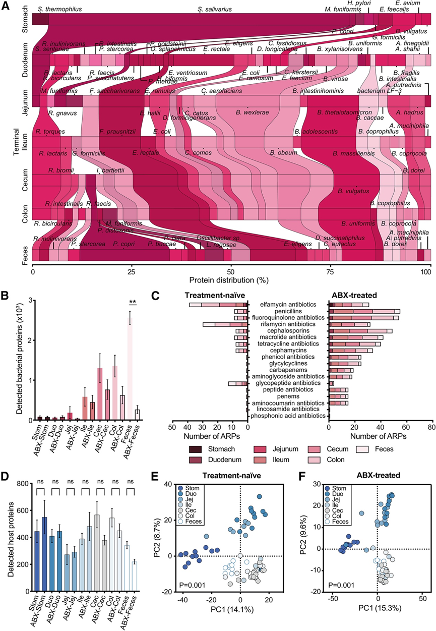 与健康个体相比,广谱抗生素治疗的特点是具有独特的生态位特异性蛋白质谱(图 2 A),这对于兼性厌氧菌的扩张非常显著,大肠杆菌和肠球菌产生的蛋白质比例在胃肠道中较高,同时伴有蛋白质(图 2 B)和物种(图 S2 B)梯度的损失。在未经治疗的个体中,在下胃肠道中检测到与对多种抗生素耐药性相关的细菌蛋白(图 2 C)。接受抗生素治疗的参与者在物种分辨的抗生素耐药谱中表现出明显的个体化改变。值得注意的是,大多数基于 MIM 的抗生素耐药蛋白 (ARP) 在粪便中检测不到,这表明粪便分析可能无法可靠地确定抗生素耐药性库的存在(图S2C)。