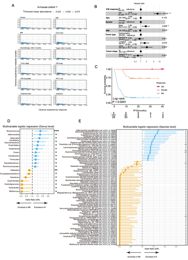 (A)人口统计。(B) 调整年龄、性别、BMI、肿瘤类型和肿瘤分期等临床因素后,Cox多因素回归分析显示内部队列1的ICB疗效结果。(C)生存分析。(D-E) 森林图显示反应者和非反应者之间差异富集的细菌属和物种。