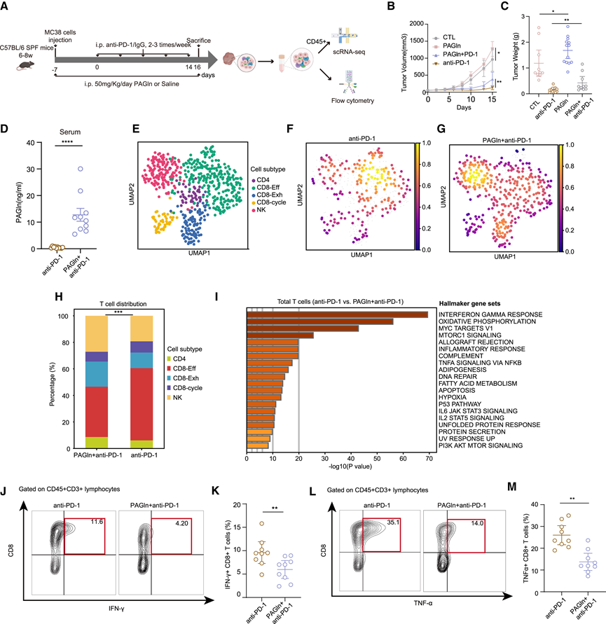(A) 体内实验的工作流程。(B) MC38 肿瘤的生长动力学。(C) 比较四组肿瘤体积的散点图。(D) 散点图显示接受或未接受 PAGln 治疗的抗 PD-1 组血清中 PAGln 的浓度。(E-G)UMAP可视化。(H) 堆积图显示抗 PD-1 和抗 PD-1 加 PAGln 组之间的 T/NK 细胞分布。(I) 条形图显示使用抗 PD-1 组中显著上调的基因进行基因集富集分析的结果。(J,L) CD8+T 细胞流式细胞分析代表图。(K,M) 散点图比较抗 PD-1 组和抗 PD-1+ PAGln 组之间IFN-γ + CD8 + T 细胞 (K) 和 TNF-α + CD8 + T 细胞的差异。