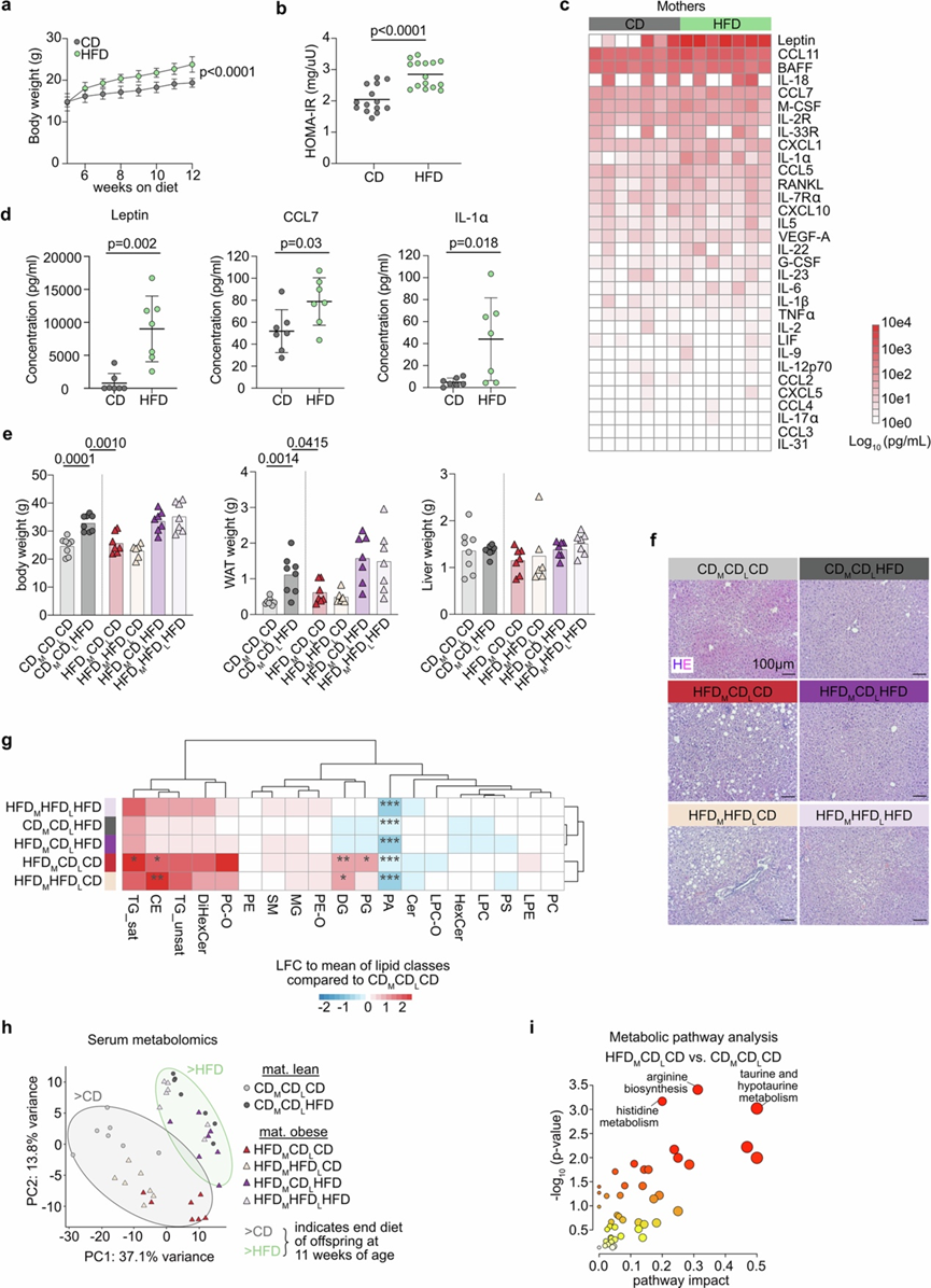 (a) 体重分析。(b) 在相应饮食 8 周后对 CD 或 HFD 母亲进行的胰岛素抵抗稳态模型评估 (HOMA-IR)。(c) 热图显示 CD 和 HFD 母亲血清中检测到的细胞因子和趋化因子的对数转换值。(d) (c)中结果的绘图,使用双尾非配对学生 t 检验显示其显著性。(e) 11 周龄后代体重、白色脂肪组织 (WAT) 和肝脏重量。(f) 后代肝脏切片的苏木精-伊红 (HE) 染色。(g) 肝脏脂质组学热图显示了不同条件下所选脂质组的CDM CDLCD的变化。(h) 通过 PCA 可视化所有实验组血清代谢组学数据。(i) 代谢通路富集分析。