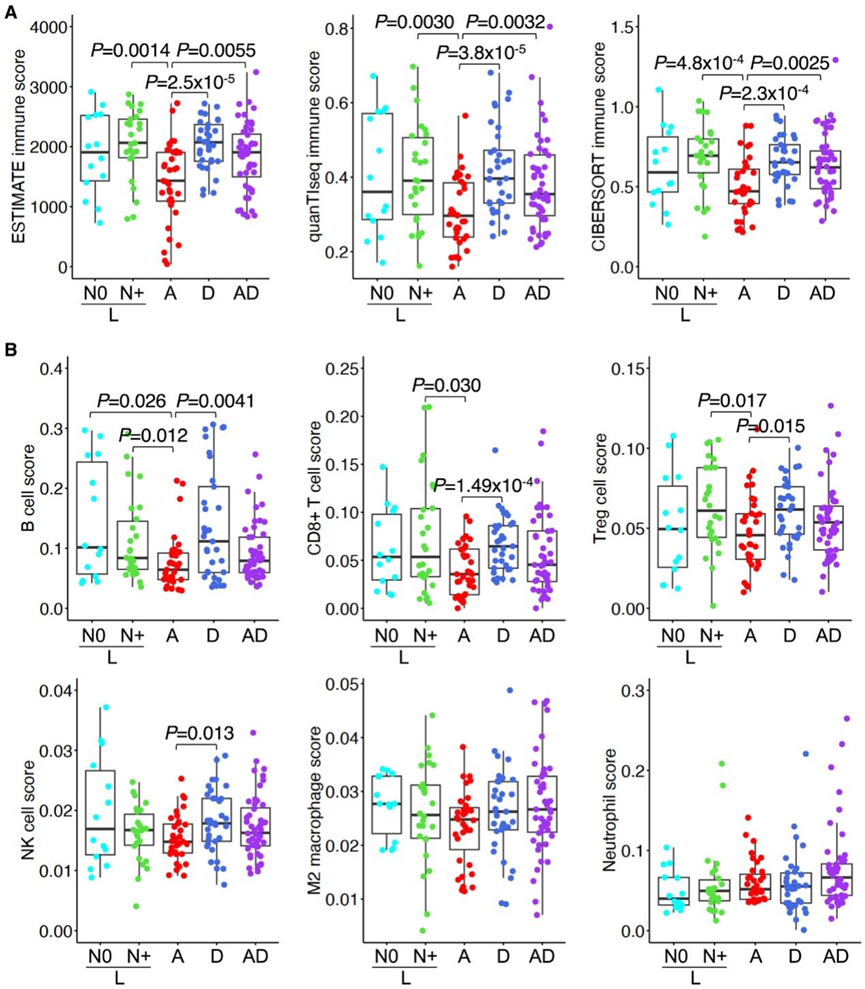 为了研究基因表达分析阐明的差异免疫活性,他们使用表达数据 (ESTIMATE) 估计恶性肿瘤中的基质和免疫细胞进行免疫估计,并使用通过肿瘤免疫估计资源 (TIMER 2.0) 提供的两种不同算法进行反卷积分析,即通过估计已知 RNA 转录本的相对子集进行细胞类型识别 (CIBERSORTx) 和 quanTIseq。与基因表达分析结果一致,他们观察到除N0 L 亚型外,所有亚型的总体免疫评分均显著高于 A 亚型(图 4 A)。