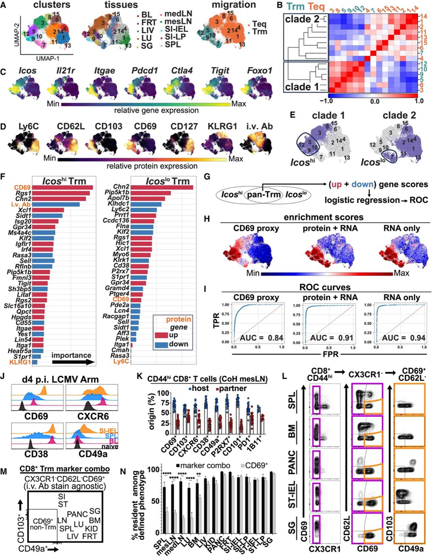 (A)UMAP可视化。(B) 皮尔逊相关系数和细胞聚类的层次聚类。(C-D) 基因和蛋白质的 totalVI 表达。(E) UMAP 图描绘了进化枝名称。(F) 差异表达蛋白和基因按通过为每个进化枝生成随机森林分类器模型获得的基尼重要性得分进行排序。(G)分析方案。(H) 富集分数的 UMAP 图。(I) 真实阳性率(TPR)与假阳性率(FPR)的 ROC 曲线图。(J) 对 LCMV Arm 感染后第 4 天的小鼠的 P14 细胞和未感染小鼠的幼稚 CD8+ T 细胞进行了指示标志物的表达评估。(K) 对共居 (CoH) 共生体中的记忆性 CD8+ T 细胞进行了指示标记评估。(L) 用于识别各种组织中的 Trm 细胞的筛选策略。(M) 针对评估组织的流动表型分析策略摘要。(N) 针对评估组织的流动表型分析策略摘要。