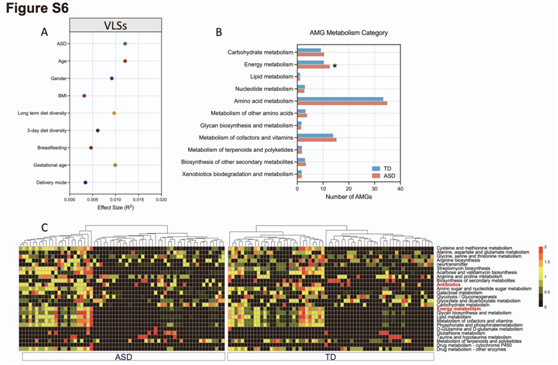 ASD的诊断与病毒功能变异的关联最大,与TD儿童相比,ASD儿童中参与整体能量代谢和抗生素耐药途径的病毒编码辅助代谢基因(AMG)显著增加(图S6A-C)。然后,他们剖析了细菌功能多样性与噬菌体AMG多样性之间的联系。