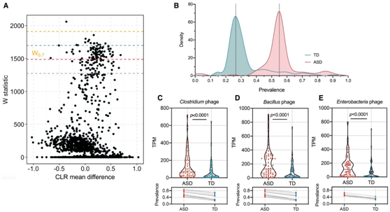 (A) 自闭症谱系障碍 (ASD) 儿童和 TD 儿童之间微生物组组成 (ANCOM) 的 VLS 分析结果。(B) 患有和不患有 ASD 的儿童中普遍存在的 177 个差异 VLS 的分布。(C-E) 点图比较了不同噬菌体之间的差异 VLS 的丰度和流行率。