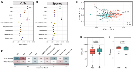 (A-B) 粪便VLS的表型,包括ASD、内在宿主因素(年龄、性别、BMI)、饮食特征(短期和长期饮食多样性)和早期生活特征(母乳喂养期、胎龄和分娩方式)和病毒分类学物种水平分析。(C)肠道VLS组成响应宿主因素的冗余分析(RDA)。(D-E) ASD和TD患儿VLS计数和Shannon多样性箱线图。(F)宿主因子与VLS丰富度和Shannon多样性的相关热图。