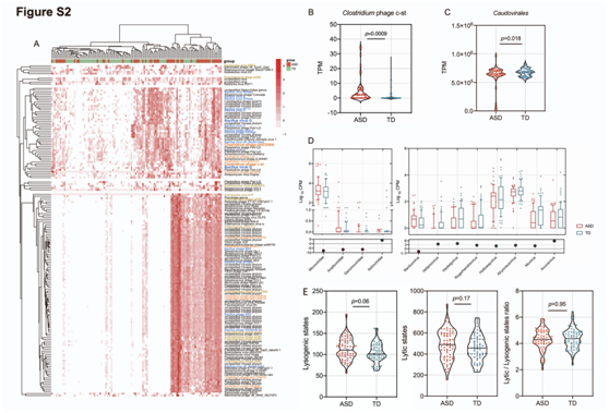 在ASD中,他们还观察到尾状病毒目的减少(图S2C),据报道,这与人类大脑执行过程和言语记忆的改善有关。此外,研究发现,与宿主免疫状态变化相关的潜在人类病原体Anelloviridae在ASD儿童肠道中的数量增加(图S2D)。在ASD中,噬菌体的溶原性略有增加,但两组之间的噬菌体的裂解状态和溶原状态之间的平衡没有显著差异(图S2E)。