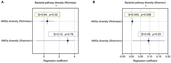 (A) 以细菌途径丰富度为因变量的线性模型系数。(B) 以细菌途径Shannon多样性为因变量的线性模型系数。