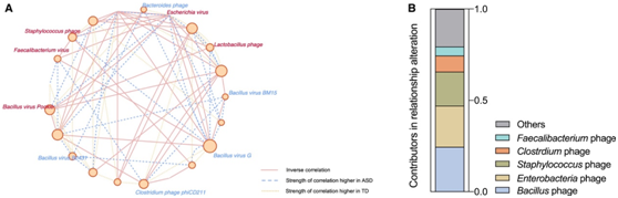 肠道微生物不是孤立存在的,而是在人体肠道中形成复杂的生态网络,微生物群落之间的相互作用对维持人体健康起着重要作用。为了进一步评估ASD患者肠道病毒群落的生态相互作用,他们追踪了两组之间常见VLS的关系变化。在这些VLS中,ASD儿童的病毒-病毒相互作用发生了改变,其特点是与TD儿童相比,ASD儿童的许多VLS关系是相反的(图3A)。Pookie芽孢杆菌病毒与埃希氏病毒在TD患儿中呈负相关,而在ASD患儿中呈正相关(图3A)。此外,富含ASD的芽孢杆菌噬菌体在病毒相互作用失调中起关键作用,导致24.5%的病毒-病毒相互作用改变,其次是肠杆菌噬菌体,然后是梭状芽孢杆菌噬菌体,分别占病毒-病毒关系改变的22.5%和8.8%(图3B)。