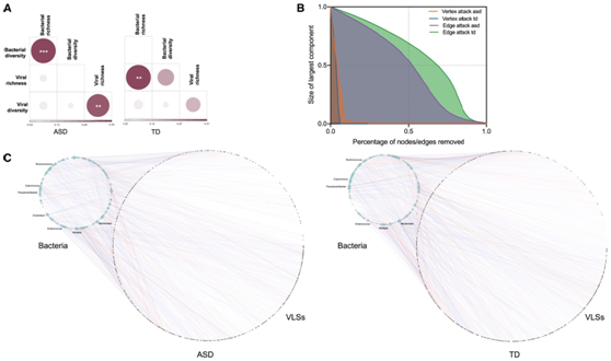 (A) ASD患儿和TD患儿肠道病毒社区网络显著改变。(B)改变后的病毒网络中VLS的比例。