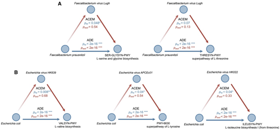 图6. 肠道细菌、噬菌体和微生物功能途径之间的介导联系。