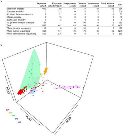 研究者团队获得了 697 例日本胃癌病例的基因组,并对 81 例进行了全基因组测序,对 603 例进行了全外显子组测序,对 520 例进行了全转录组测序。他们收集了来自癌症基因组图谱(TCGA) (https://portal.gdc.cancer.gov/projects/TCGA-STAD)的442例(多祖先)病例和来自东亚队列(中国、韩国、新加坡和越南)的318例病例的全基因组、全外显子组和转录组数据(图S1a),种系变异的主成分分析(PCA)证实了样本的祖先(图S1b)。