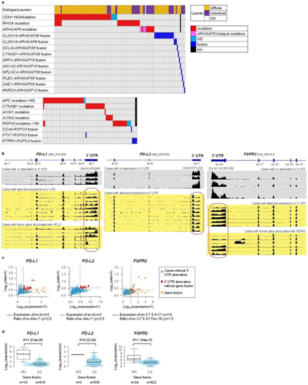 (a) RHO-GAP 融合体的互斥分布,例如非超突变病例中的CLDN18 - ARHGAP26和CDH1/RHOA/ARHGAP5突变(上)。非超突变病例中WNT 通路(APC、CTNNB1、AXIN1/2和RNF43)突变和RSPO3融合的互斥分布(下)。(b)典型PD-L1、PD-L2和FGFR2 3' utr异常病例的RNA-seq读取深度。异常病例(红色虚线圈)的3'UTR归一化读深度全部或部分低于正常病例。(c) PD-L1/2和FGFR2编码外显子高表达,基因的3 ' UTR外显子表达降低。(d)基因融合阳性和基因融合阴性病例的编码表达比较。