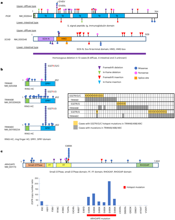 PIGR是一种弥漫性驱动基因,具有复发性和广泛分布的失活突变(图3a),与CDH1显著共改变(图2f)。PIGR参与上皮细胞中可溶性免疫球蛋白A的胞吞作用,并与极性完整性和粘膜免疫有关。此外,PIGR突变下调再生结肠上皮中白细胞介素-17 (IL-17)信号。SOX9是另一个扩散型驱动基因,其特征是反复出现移码插入和纯合缺失(图3a)。在2.2%的非高突变病例中,TRIM49家族(TRIM49/ 49b / 49c)反复出现热点突变(图3b)。TRIM49蛋白含有RING和SPRY结构域,可能参与自噬蛋白的降解。S327R/G/C热点替换位于SPRY域,且几乎互斥(图3b)。
