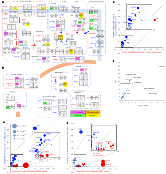 (a) 非超突变胃癌的致癌信号传导途径。 (b) 非超突变胃癌的核内致癌途径。(c-e) 非高突变胃癌在弥漫型和肠型之间、EBV 阳性和 EBV 阴性病例之间以及东亚和欧洲血统病例之间之间的 SMG 存在显著差异。 (f) 非超突变病例中 SMG 显著共同改变。