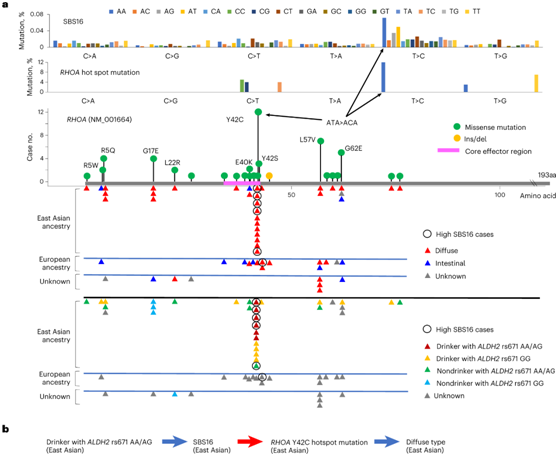 (a) SBS16和RHOA热点突变之间相似的替代模式。 (b) ALDH2基因型、饮酒量、SBS16、RHOA Y42C热点突变、弥漫型和东亚血统之间的相关性总结。